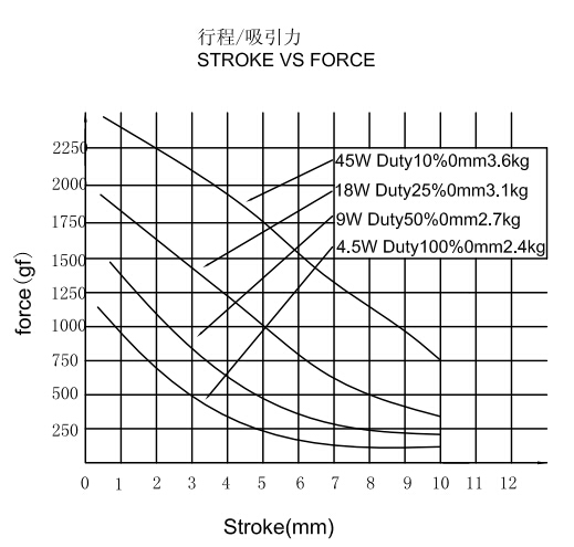 縱向:代表電磁鐵在對應行程時的力量 單位為克(g)