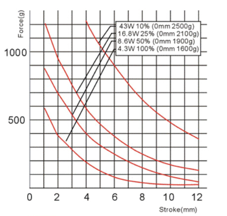 縱向:代表電磁鐵在對應(yīng)行程時的力量 單位為克(g)
