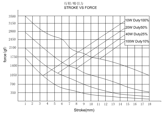 二、T2550圓管式電磁鐵行程力量曲線圖: