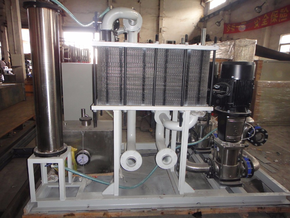 本產品由熱交換器、離子交換器泵組、高位膨脹水箱、管道和電氣控制等部件組成。水-水熱交換器采用波紋平板式,其換熱原理為將從整流器流進之載熱純水熱量以間壁傳熱方式傳遞給付水輸出機外,冷卻后的純水經加壓后返回整流器水道,周而復始,形成閉合循環冷卻回路。離子交換器采用混合床形式制取純水以維持主回路于額定水質。泵組由二臺互為工作、備用的不銹鋼水泵組成,是主回路的動力源。高位膨脹水箱按放位置高于負載主機,具自動集氣和排氣之功能。主回路管道通過外接管與負載主機冷卻水道連接成閉合循環回路。機內各容器和主水管路均采用不銹鋼材質制造。